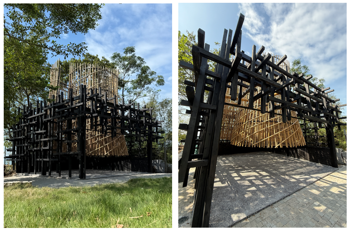 外部是深色、紋理豐富的燒焦木牆,隨著日光的變化,創造出光與影的變化圖案。由現代鋼框架支撐,這個場所和諧地將天然材料與現代設計結合在一起,使其成為一個令人難忘的會議、靜修或特別活動場所。鋼與竹的結合象徵傳統工藝與現代工程之間的和諧。