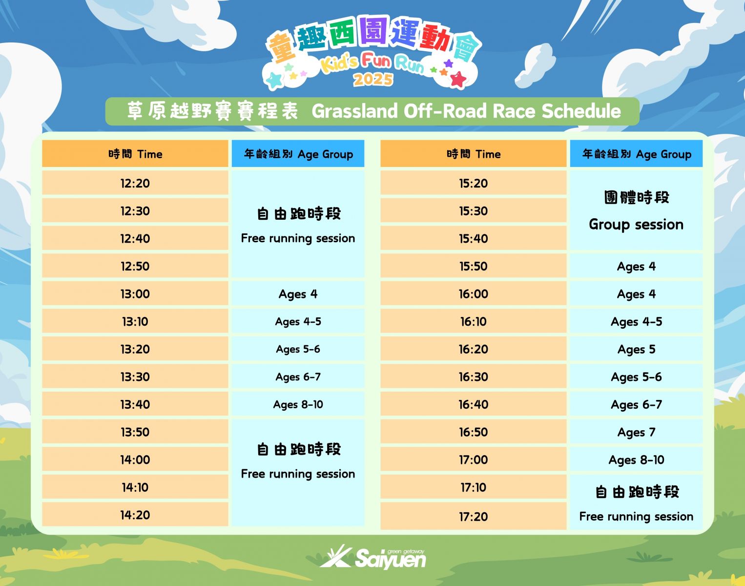 04|【草原越野賽】分齡賽程表 Age Group Race Schedule 草原越野賽是當日重要項目,參加者可按照報名的時段及年齡,計劃遊玩攤位及午餐時間!